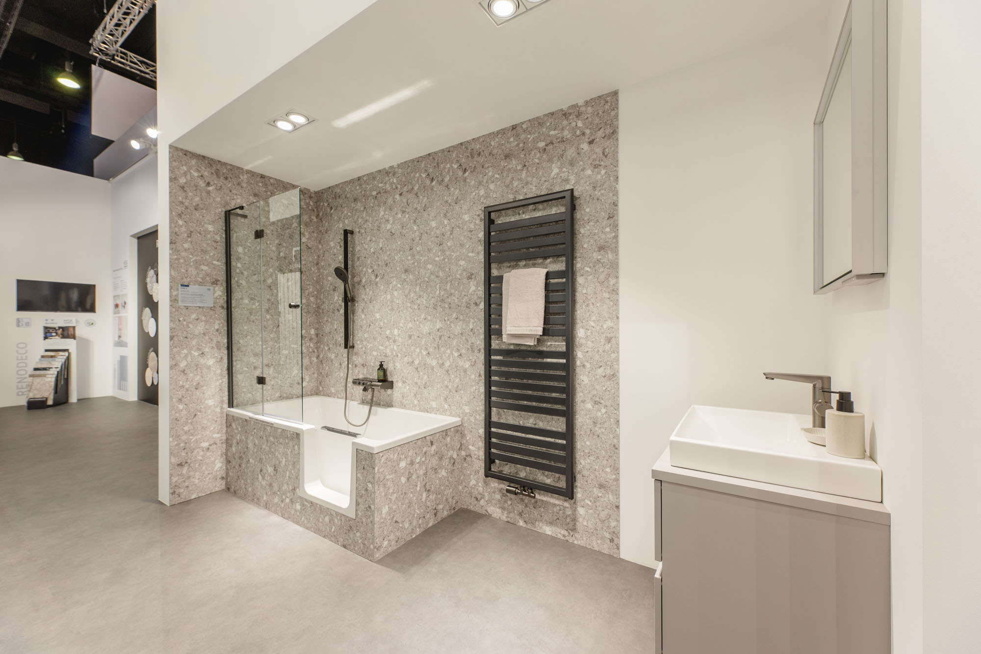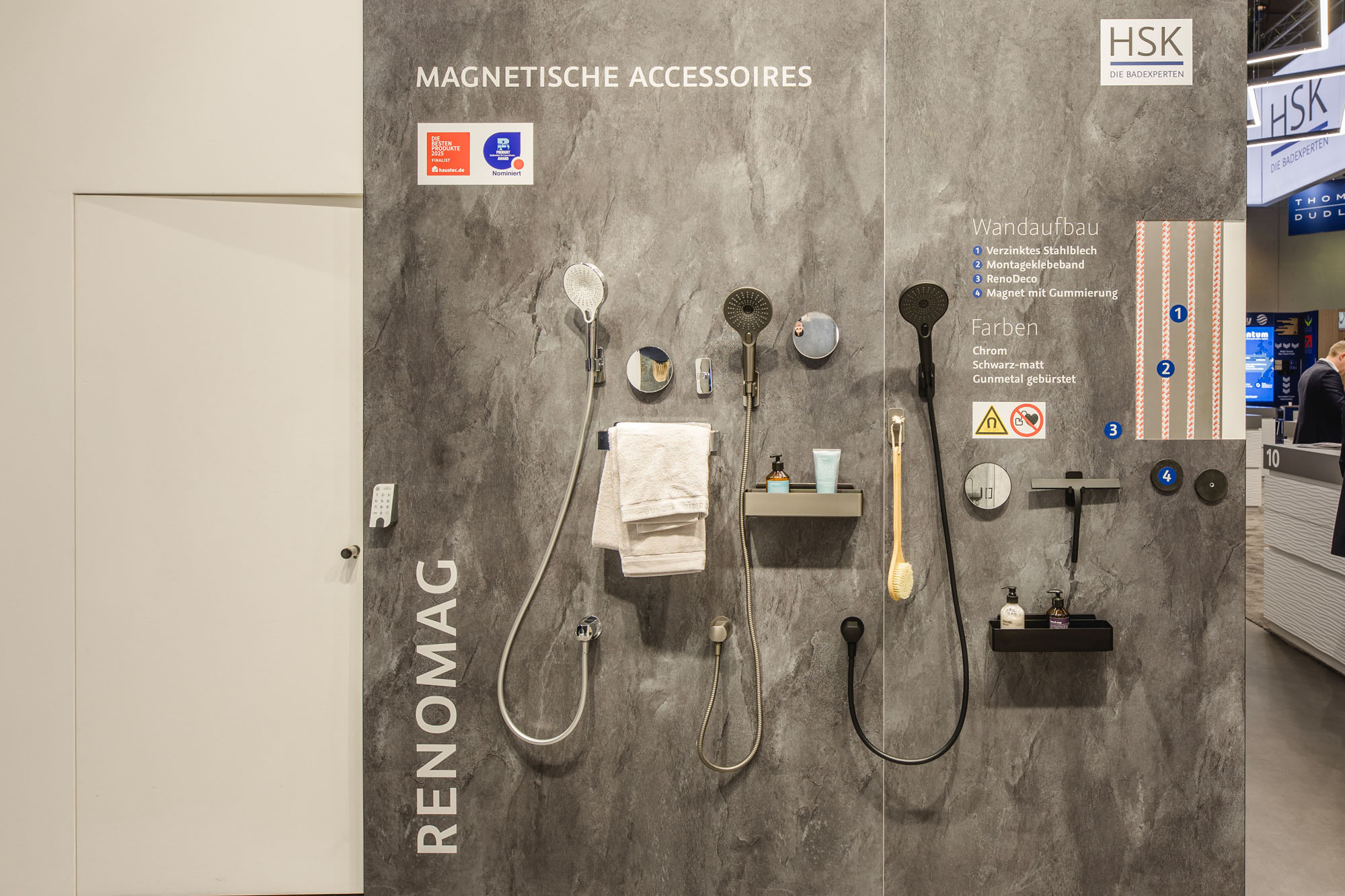 Auf dem Messestand auf der ISH 2025 wurden die neuesten Entwicklungen rund um den Duschplatz vorgestellt. Mit durchdachten Duschkabinen, maßvariablen Duschwannen, elektrischen Designheizkörpern und funktionalen Armaturen & Accessoires wurde gezeigt, wie modernes Baddesign, Nachhaltigkeit und maximaler Komfort perfekt zusammenpassen. Besonderes Highlight auf dem Messestand: das neue, innovative RenoMag System für die fugenlose, zu 98% aus recycelten Materialien bestehende und zu 96% recyclebare, Wandverkleidung RenoDeco. Die magnetischen Badaccessoires lassen sich mithilfe einer magnetischen Rückwand für RenoDeco flexibel anbringen, umpositionieren und zur erleichterten Reinigung abnehmen. Auch der elektrische Designheizkörper Yenga-E stieß auf großes Interesse. Mit programmierbarer Heizwärme, App-Steuerung und energieeffizienter Technik bietet er eine smarte, alternative Heizungslösung für den zusammenpassen.